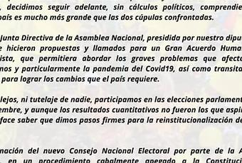 Desde la Junta Directiva de la Asamblea Nacional, presidida por nuestro Diputado Luis Parra, se hicieron propuestas y llamados para un Gran Acuerdo Humanitario y Nacionalista, que permitiera abordar los graves problemas que afectan a los venezolanos y particularmente la pandemia del Covid19, así como transitar la ruta electoral para lograr los cambios que el país requiere.