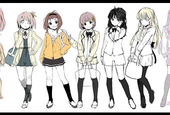 La imagen de arriba presenta los diseños iniciales de algunas de las chicas, y revela que el personaje que se convirtió en Kimie Kamata (gif a continuación) fue uno de los conceptos iniciales para Himawari.