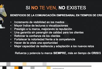 La comunicación es un pilar esencial en cualquier empresa y debiera estar integrado en su estrategia empresarial. Una empresa ha de comunicar siempre de manera eficaz, transparente, y con actitud positiva porque está en juego uno de los activos más relevante de la empresa, su imagen, su marca, en definitiva, su esencia. La comunicación, juega un papel esencial antes, durante y después de la crisis, siendo sus profesionales son expertos en paliar los daños de la misma. El silencio es el mayor enemigo de las empresas. Las empresas han de adaptar y reorientar su comunicación con eficacia hacia sus necesidades, servicios o productos durante el ciclo de vida de la crisis y forjar una oportunidad de esta.