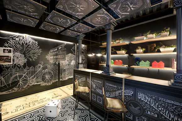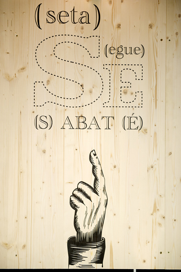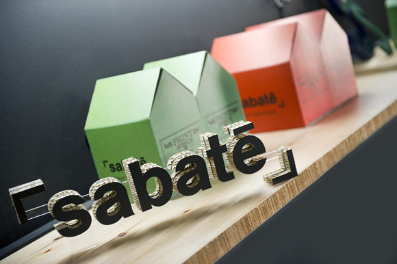 "Todos sabemos jugar y gastar. Sabaté con Egue y Seta le proponen invertir menos y divertirse el doble. Un tablero de tarima de madera impresa con grabados de principios del siglo pasado, nos introduce casilla a casilla, en la propiedad más rentable y lúdica de la casa. Un hall, una sala de espera y una recepción; o si prefiere, una tienda con su mostrador y un catálogo de revestimientos impresos penetrable. Todo acompasado bajo una estética única que hace guiños al tradicional juego de estrategia, mientras nos propone una estrategia decorativa fresca, sostenible y personalizable : La impresión"