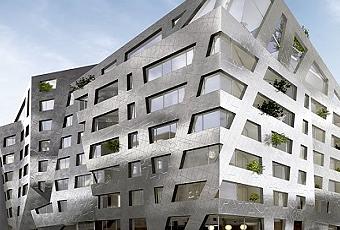 Con grandes ventanas angulares diseñadas para atrapar el máximo de luz, paredes inclinadas, y una fachada metálica recubierta de cerámica, los 10.000 m2 del bloque ocupan la esquina de Chausseestrasse 43 en el centro de Berlín.