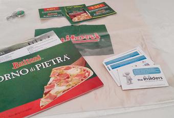 Una guía de la campaña,tarjetitas de Insiders,un bolso de tela de Buitoni,encuestas sobre el producto,3 vales para probar gratis 3 pizzas de jamón y queso de Buitoni Forno di Pietra y un montón de vales descuento de 0´50€ para repartir(con estos últimos puede elegirse cualquier variedad)y un llaverito.