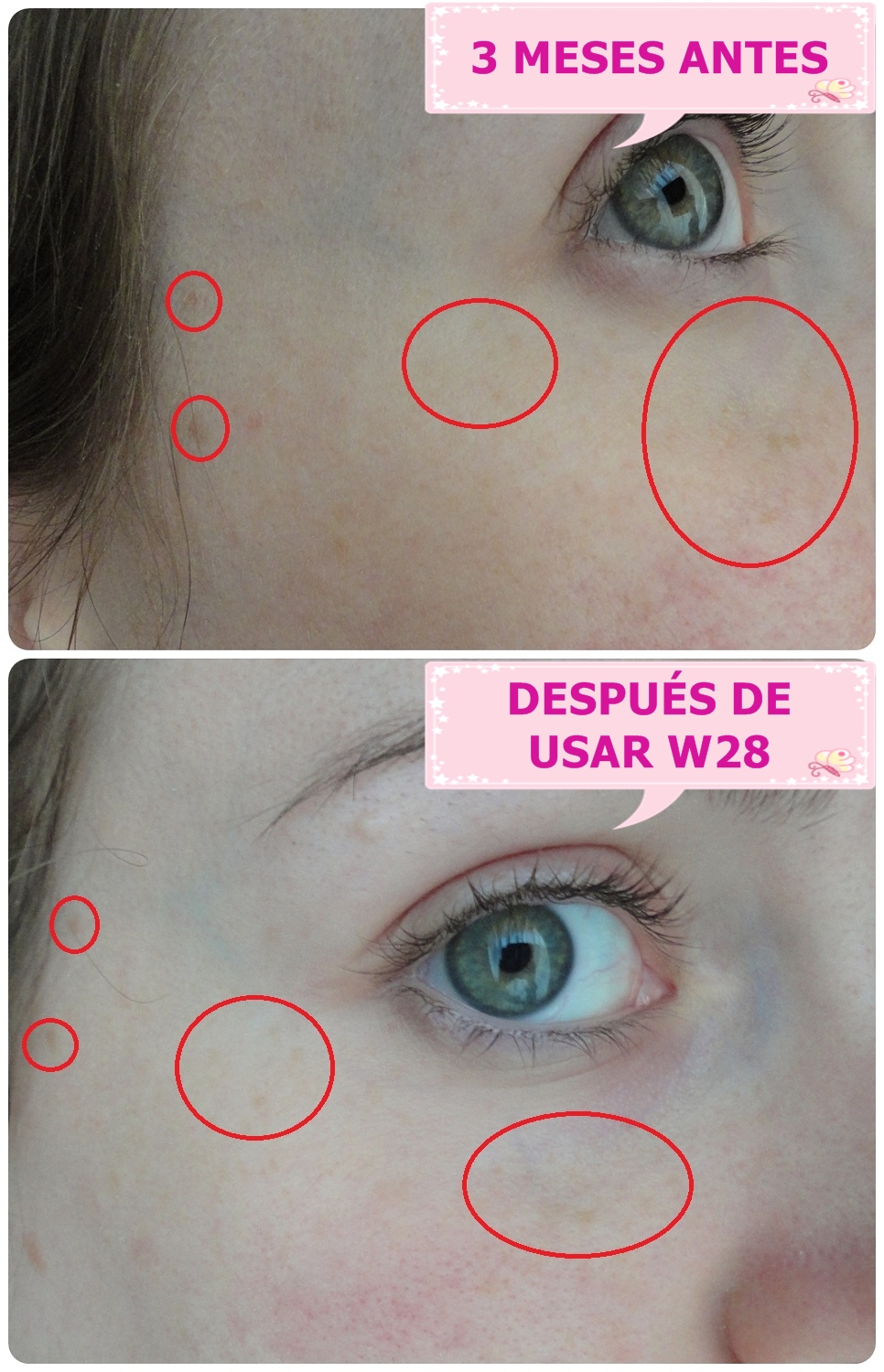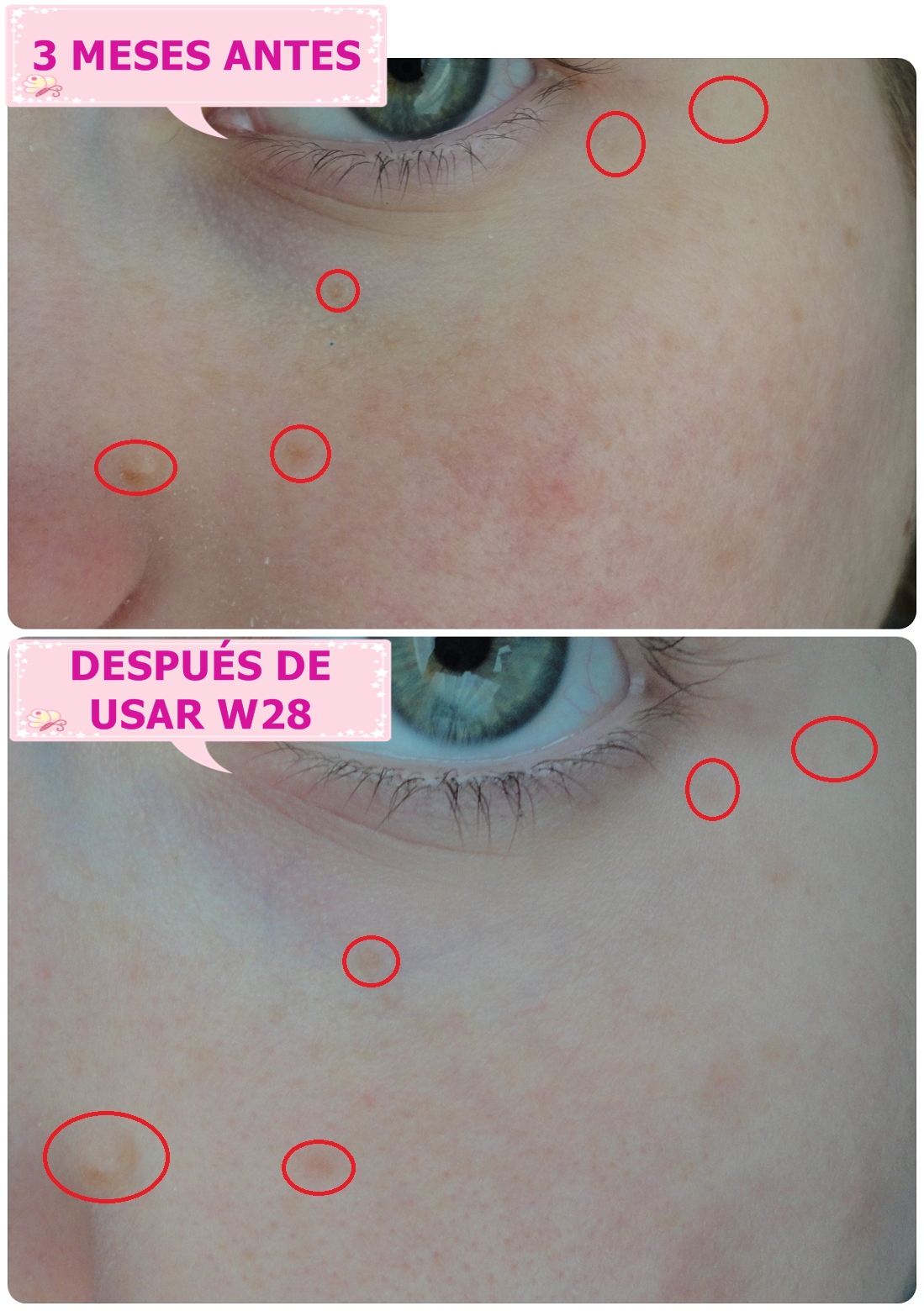 Lo he aplicado como indican las instrucciones y me lo dejaba durante 15 minutos (siempre tiro al máximo tiempo para todo^^). Para retirarlo no hay ninguna complicación porque tan sólo hay que quitarlo con agua y no cuesta nada.Pero, ¿he notado resultados? pues después de todos estos meses sí que noto mejoría sobre todo al comprobar las fotos del antes-después. Veo que se me han aclarado las manchitas que tenía en la piel, las típicas pequitas que suelen salir por el sol cada año y también las manchitas de los granitos que me salen con la mentru. Yo ya tenía varias que me han quedado de otros años y en verano suelen aparecerme más. Este año precisamente he empleado este producto los meses de verano: Junio-Julio-Agosto y, a parte de que noto que se me han aclarado mis manchitas, ¡no me han salido más como me pasa cada año! Soy de ponerme protector solar antes de maquillarme pero aún así nunca he podido evitar la aparición de pequitas. Se me han aclarado pero no han desaparecido, pero ya es mucho con ver que tengo la piel en un tono más homogéneo.Pero algo que tenía que comentar es que NO me ha disminuido el tamaño de los poros como también indica el producto jeje, sé que ese no es su fin pero como lo pone quería comentarlo por si alguna quería saberlo. Lo que sí he notado es que es verdad que deja bastante limpios los poros y los desinfecta.¿Queréis ver fotitos?1. Antes de nada decir que no me gusta demasiado mostrar mi piel sin maquillaje, pero quería que vierais resultados así que os enseño los lugares que son más conflictivos para mi en cuanto a manchitas para que comparéis.2. También decir que he tomado las fotos del antes y del después en las mismas condiciones pero aún así no he conseguido que se vean igual, pero ya veréis que en las actuales se ven las manchitas y también los poros super marcados, así veis que no hay truco, están bien enfocadas :)3. He rodeado las mismas zonas o manchas para que no tengáis que buscar tanto las diferencias xDDD4. He intentado dejarlas con más píxeles de lo que suelo emplear para que lo veáis con más detalle, creo que si las pulsáis os salen más grandes (o eso tocaría u.u').MI FRENTE: