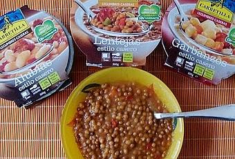 La empresa Carretilla tuvo la amabilidad de enviarme una muestra de sus productos. En este caso fueron alubias, lentejas y garbanzos al estilo casero.He probado las lentejas y la verdad es que están muy buenas. Como suelo decir, una buena opción para un día de prisas o para llevar al trabajo. Se puede calentar en el microondas, y vienen con un tenedor de plástico.