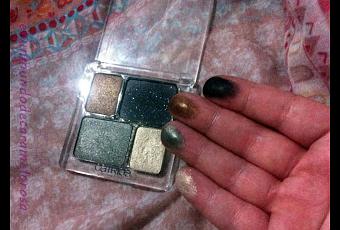 Se compone de una sombra marrón tirando a bronce, un gris oscuro con destellitos de todos los colores, un grisaceo verdoso y un color champán perfecto para iluminar.