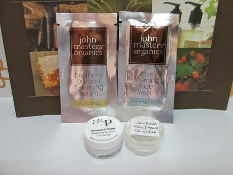 También he probado algunas muestras de la marca "John Masters Organics". El tónico hidratante de rosa y aloe y el sérum regulador facial para pieles grasas, me han gustado mucho. Tienen aromas muy envolventes y suaves. Dejando la piel con un tacto muy agradable... El sérum lo probé por la noche, y a la mañana siguiente casi que no tenía nada de brillitos, asi que, seguro que si lo pruebo unos días más, va a ser un producto que me va a encantar....