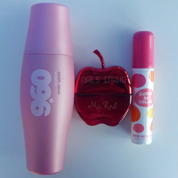 9.60 Woman Sport Water / DeliplúsEs un bote bastante grande porque trae 200 ml. Es un olor dulce y nada empalagoso por lo que resulta una fragancia fresca para el verano, yo diría que es un olor frutal. El olor a mi me dura muy poco. Vamos para mí es más para salir a comprar y poco más porque en mi enseguida se le va el olor. Si repetiría con ella porque me gusta el olor que tiene y además el precio esta genial.Gota De Color / Agatha Ruiz De La PradaEsta es un olor frutal, pero no puedo con ella, en mi me acaba molestando el olor y encima es que me dura un montón en mi puesto el olor. Acabo siendo usada de perfumador y abriendo la ventana para que el olor fuera menos intenso porque no es para mi la fragancia. Si es verdad que la huelo y me gusta el olor pero en mi no la aguanto.
