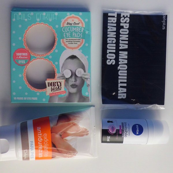 Esponjas maquillaje Triángulos DeliplúsSiempre las compro ahí, me gustan y son baratas, aunque tengo brochas y otro tipo de esponjas yo creo que la mayoría de veces acabo usando siempre de estas.Nivea Invisible Black&WhiteMe gusta mucho el olor, a mi me controla bien el sudory a mi la verdad que no me ha dejado por el momento en la ropa que lo he usado manchas. La pega que lleva aluminio.Exfoliante Antidurezas DeliplúsMe gusta mucho, lleva partículas de piedra pomez, me deja los pies muy suaves y repito siempre con el.Cucumber Eye PadsSon de pepino y aloe vera, había que dejarlo de 2 a 3 minutos y se recomienda meterlo en la nevera 15 minutos antes de usarlo.No los voy a volver a comprar porque no me hacen nada y encima si algo de liquido rozaba el ojo me molestaba. Una perdida de tiempo y de dinero en mi esté producto. De momento este tipo de productos sea tanto de rodaja o para debajo del ojo por lo menos en mi opino que no valen para nada.