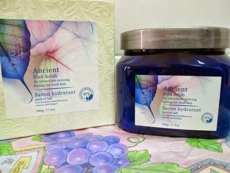 El siguiente producto, se trata del "Acient Foot Scrub", el cual se presenta en un tarro de plástico de color azul marino, que trae 500 gramos de cantidad.
