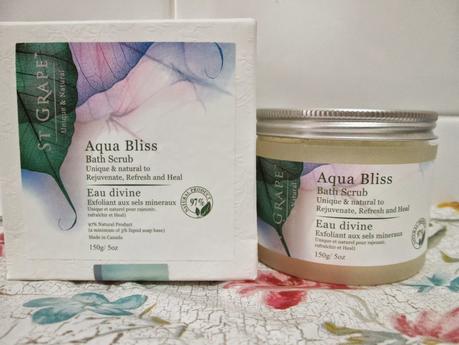 El primer producto que os enseño, se trata de "Aqua Bliss Bath Scrub", el cual se presenta en un tarro de plástico semi-transparente, muy bonito, con 150 gramos de cantidad.