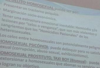La polémica diapositiva que sirve de guía a la clase constituye una discriminación desde su encabezado al hablar de «delito homosexual», siguiendo por que considera las relaciones entre dos personas del mismo sexo como un «trastorno psíquico», defendiendo que son «más violentos y sangrientos» y se mueven «por celos y venganza», describiendo que «los celos entre homosexuales son potencialmente peligrosos». También encuadra los delitos de exhibicionismo o abuso sexual como acciones de un «homosexual psicópata», que sería aquel que cometes crímenes «para su satisfacción sexual». Asímismo, destaca otros tipos de homosexuales como el «homosexual prostituto», que «puede matar o extorsionar a los homosexuales que abonan su servicio, cuando no logran su cometido»; y el «homosexual latente», que define como alguien que «teme por su deseo erótico mata a un homosexual» en lo que denomina una «actitud sexual reivindicatoria» en lo que explica es una manera de re asegurar «su virilidad cuestionada».