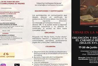 El Proyecto de Investigación CARMEL-LIT. “Mulier fortis, mulier docta”. Hibridismo literario y resistencia en las comunidades carmelitas posteresianas (siglos XVI-XVII) [PID 2020-114810GB-I00], convoca el Congreso Internacional Vidas en la memoria. Erudición y escritura en el Carmelo reformado (siglos XVI – XVIII), que se celebrará entre el 17 y 20 de junio de 2024 en la Casa de Velázquez, la Universidad Complutense de Madrid y el Centro Internacional Teresiano-Sanjuanista-Universidad de la Mística de Ávila.