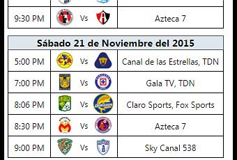 Sábado 21 de noviembre de 2015America vs UNAM 17:00 - Televisa 2Tigres vs Cruz Azul 19:00 - GalaTVLeon vs Dorados 20:06 - ClaroSportsMorelia vs Veracruz 20:30 Azteca 7Chiapas FC vs Pachuca 21:00 - Sky