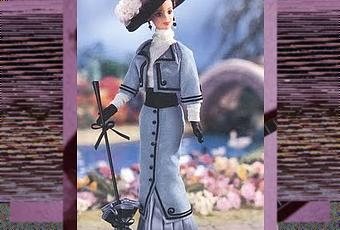 De la colección grandes modas del siglo XX, llega a nosotros Barbie paseo por el parque, esta es la primera de la serie de esta fabulosa colección, vestida en un traje típico de paseo de la época del año 1910, Barbie va de azul con una impresionante pamela y una sombrilla para protegerse del sol, ya que en la época la blancura de la piel era símbolo de riqueza. Esta preciosa muñeca es del año 1997 y es collector edition.