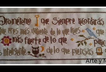 Cada vez me aficiono más a estos bordados con mensaje. Este me gustó mucho cuando lo ví en un grupo de Facebook y me apunté a hacerlo. El resultado me encanta. Voy a regalárselo a mi niña, que anda en la edad mala, a ver si consigo que nunca se olvide de lo especial que es. Gracias por la visita. Toñi.