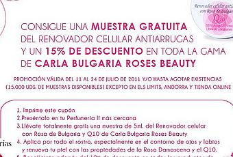 Además para completar esta promoción, las Perfumerías IF aplicarán durante las mismas fechas un 15% de descuento en toda la línea Carla Bulgaria Roses Beauty.