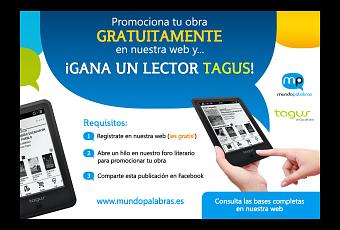 Se trata de un nuevo sorteo bajo el nombre de «¡Promociona tu obra gratuitamente en mundopalabras.es y gana un lector Tagus!» dirigido a todos los escritores que deseen darle difusión a su obra, ya esté terminada o no, mediante el cual Mundopalabras.es regalará un lector electrónico Tagus al autor que utilice su foro literario para promocionar ¡gratis! su obra y consiga más respuestas a su publicación.