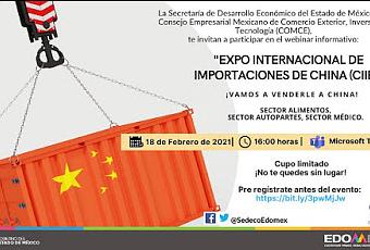 Toluca, Estado de México.- El Gobierno del Estado de México, a través de la Dirección General de Industria, con apoyo del Consejo Empresarial Mexicano de Comercio Exterior, Inversión y Tecnología (Comce), invitaron a empresas mexiquenses para participar en un webinar informativo el próximo 18 de febrero a través de Microsoft Teams, orientado a abrir su participación en la cuarta edición de la Expo Internacional de Importaciones de China (CIIE) 2021.