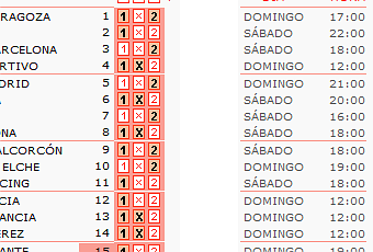 14.Recreatico-Xerez……………..1/X: Este es posiblemente el partido más complicado, aunque el Xerez no conozca la victoria desde hace bastantes jornadas, concretamente nueve, el Recre sólo ha ganado un partido de sus últimos ocho disputados. Los dos equipos viven una mala racha de resultados, quizás el que peor está de los dos sea el Xerez que además asumirá este compromiso como visitante.