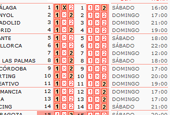13.Girona-Murcia……………..1/2: Ojo con este partido donde en principio los catalanes son tremendamente superiores pero que juegan ante un Murcia amenazado seriamente por las plazas de descenso. Sería una sorpresa el 2 que revalorizaría mucho el boleto. Hay que tener en cuenta también las numerosas bajas con las que cuenta el Girona para esta jornada, el Murcia en esta segunda vuelta sólo ha ganado un partido como visitante, en el difícil campo del Mirandés.