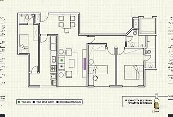 El dibujo abajo muestra el plan de una casa con detalles informados en leyenda, en inglés. Dos hombres estarían en el sofá de la sala viendo a una película gay. El cuadradito verde es 'su hijo' (your song), el azul, 'el amigo de su hijo' (your son's buddy), y el morado, la película 'Brokeback Mountain', que narra la historia de dos vaqueros gayes enamorados. Al lado derecho, una botella y el siguiente mensaje: 'si tiene Usted que ser fuerte, nosotros tenemos que ser fuertes' (If you gotta be strong, we gotta be strong).