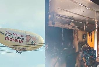 SLP.- Esta mañana propaganda de la candidata a la gubernatura por MORENA, Mónica Rangel, provocó corto circuito en líneas de suministro eléctrico y por consiguiente incendio en una casa habitación en la colonia Valle Dorado.