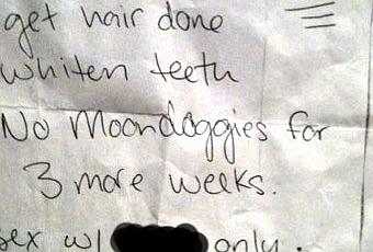 A alguien se le ha caído en un bar su lista de propósitos, me da pena el pensar que ahora ya no los va a realizar, parecen tan importantes, sobre todo el de los Moondoggies que no va a querer durante las próximas tres semanas, seguramente que son unos dulces demasiado tentadores pero con muchas calorías, y claro, habrá que cuidar la figura. Veo que va a dejar la promiscuidad, pues tiene el firme propósito de tener sexo con una sola persona y desde luego que alguien le va a echar de menos pues no le volverá a llamar aunque se ha arrepentido de borrar su número de teléfono. Y también va a beber menos, sólo cuatro veces por semana, creo que voy a adoptar esta lista para mi, con añadir un par de cosillas, como lavar el coche de vez en cuando y comer menos comida china, sería una lista ideal.