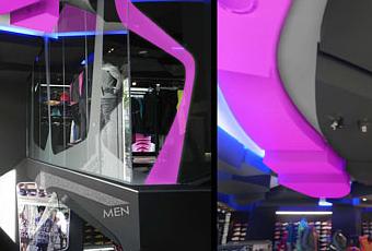 En el interior destaca el falso techo, cuyo diseño responde a la conceptualización de las suelas de calzado deportivo, aprovechando estas formas para ubicar tiras de luz led que aportan una iluminación indirecta en tonos azulados.