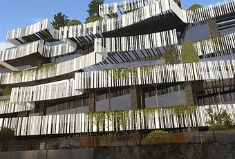 En estas composiciones que os mostramos a continuación podéis ver los diferentes acabados propuestos para el diseño de la fachada de este edificio. Se plantea un nuevo diseño de fachada con una carga escultórica reflejada principalmente en las pérgolas de las terrazas. En el exterior vemos muros de piedra con un acabado gris oscuro, amplios ventanales de vidrio gris oscuro y separadores en vidrio gris mate.