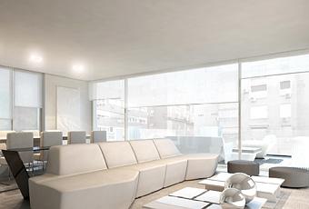 Se cran espacios díafanos donde todos los ambientes quedan conectados, gracias a la continuidad de acabados: suelos de madera clara, paredes y techos en color blanco, y el uso de mobiliario con acabado lacado (y tapizado) en blanco que siguen las líneas diseñadas por A-cero.
