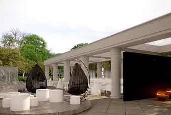 Bajo las pérgolas se sitúan unos paneles en vidrio negro frente a los accesos del jardín que dan la bienvenida al recinto al mismo tiempo que forman una división para proteger la intimidad de la zona de barra y chill out. Estos paneles pueden ser desplazados para ganar superficie y añadir mobiliario.