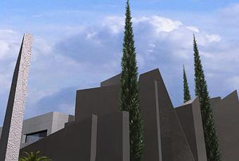 Frente a la segunda propuesta formada por un dinámico juego de muros curvos en piedra granito oscuro y mármol travertino, A-cero plantea un primer diseño de estructuras superpuestas más agresivas en cemento visto.