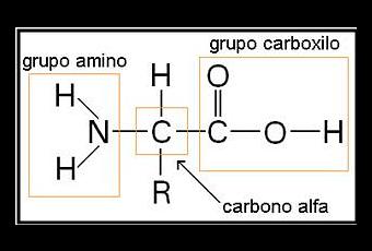 Las proteínas son polímeros biológicos de aminoácidos. Los aminoácidos presentes en las proteínas de todos los seres vivos son 20; éstos se caracterizan por poseer un grupo amino y un grupo carboxilo unidos a un carbón y se diferencian por su radical R.