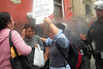 Llevando una banderola donde pedían el cumplimiento del dictamen de KL a cinco años de haber sido emitido, dos policías despojaron violentamente de la misma a dos integrantes del Centro Flora Tristán, donde como consecuencia una de ellas terminó con cortes en los dedos, los que tuvieron que serle suturados.Las activistas intentaron explicar a la policía que sólo ejercían su derecho a la libre expresión sin alterar el orden público ni el tránsito, pero les fue imposible, ya que sólo encontraron como respuesta nuevos insultos, más empujones y golpes con los escudos en brazos, espaldas y cabezas.Mujeres de Demus, CLADEM Perú, Campaña 28 por la Despenalización del aborto en América Latina, Campaña por una Convención Interamericana de los Derechos Sexuales y los Derechos Reproductivos, Kolectiva de Rebeldías Lésbicas y estudiantes, exigieron ser tratadas como ciudadanas, sin embargo lo único que encontraron fue ser violentadas.