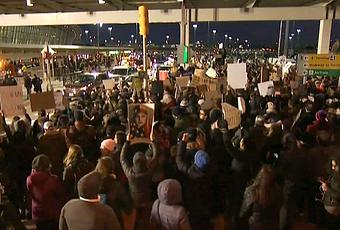 La protesta se organizó tras conocerse que varias personas habían sido detenidas en el aeropuerto y habérseles impedido la entrada al país.