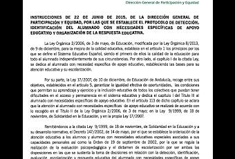 Las instrucciones de 22 de junio de 2015, de la Dirección General de Participación y Equidad, regulan un protocolo de detección, identificación y organización de la respuesta educativa del alumnado con necesidades específicas de apoyo educativo de aplicación en todos los centros educativos. Son varias las novedades que incluye relacionadas desde el momento en que se detecta una posible necesidad hasta la emisión del informe psicopedagógico y organización de la respuesta escolar.