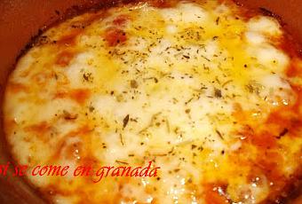 Elaboración: - Se pone en una cazuela de barro o el recipiente que pensamos usar para el horno un poco de tomate frito, jamón serrano muy picado, mermelada de pimientos y el queso.
