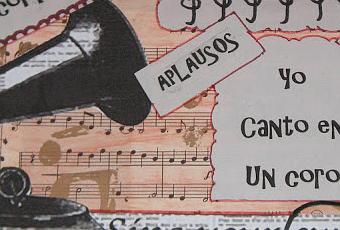 Esta es la página de la décima semana. Es una página doble muy sencilla. Cubrí completamente dos hojas del cuaderno con dos trozos de papel de regalo, uno de escritura y el otro de música. Como eran muy brillantes, los envejecí con gouache color marrón. Encima pegué el fonógrafo antiguo y la maquina de escribir antigua. Los encontré en unas láminas sobre papel de escritura acompañados de mensajes motivantes: "Canta tu propia canción" y "Escribe tu propia historia" y los usé como metáfora de lo que quería decir. Escribí e imprimí el resto de frases que completan las hojas. Cada vez me gusta más este proyecto. Me gusta la sensación de estar delante de las hojas, tomar la caja de recortes y empezar a montar algo.
