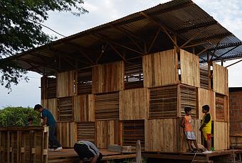 Después de hacer las bases con hormigón y ladrillos, la casa se articula modularmente en base a los pallets, construidos con madera de pino, utilizados generalmente para soportar carga de mercancías en grandes bodegas. Cuartones, palos y tiras son utilizados como soporte estructural. Las ventanas fueron construidas con madera semidura y tiras de desecho recicladas. Al final, planchas de zinc son utilizadas para elaborar el techo.