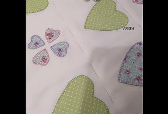 para la trasera he elegido una tela de algodón con franjas anchas en colores alegres y ya he empezado a acolchar alrededor de los corazones💙💗💚