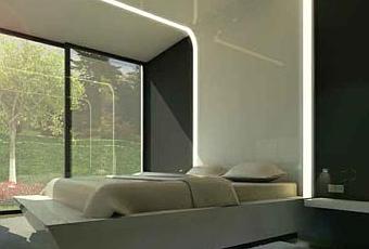 En los dos dormitorios podemos encontrar la cama modelo Capri con un cabecero que se prolonga hacia gran parte del techo, con tiras de luz led que delimitan sus bordes.