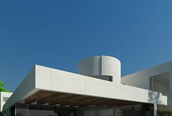 Para dotar el proyecto de cierto movimiento se pretende crear una serie de montículos de césped con distintas orientaciones entre las plantaciones de arbustos. Marmol travertino y vidrio son los materiales que se han utilizado para los exteriores.