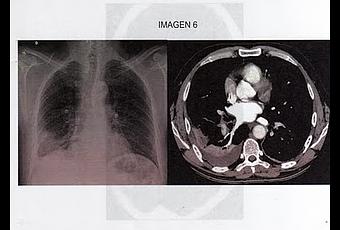11.- Hombre de 63 años, fumador importante, intervenido hace un mes de neoplasia de sigma, acude al servicio de Urgencias por presentar disnea de 48 horas de evolución que comenzó bruscamente y se ha acompañado de esputo hemoptoico y dolor torácico derecho de características pleuríticas. En la exploración, el paciente está ansioso, sudoroso, cianótico y se constata temperatura de 37.8ºC, una frecuencia respiratoria de 34 rpm y una frecuencia cardiaca de 120 lpm. La presión arterial es de 100/55. En la ACP, se comprueba la existencia de taquicardia, un 2º ruido pulmonar más fuerte y un roce pleural dcho. La GAB a aire ambiente: PH 7.32, PCO2 de 28, PO2 de 50. En el ECG, se observa una onda T invertida de V1 a V4. Tras Oxígeno, la saturación de O2 es de 90%. Se realiza Rx de tórax y TC espiral de tórax con contraste. De las siguientes opciones, en relación al manejo de este paciente, ¿cuál es la más acertada?1.- VMNI y broncodilatadores2.- Cefotaxima iv 2 grs/8 horas y Azitromicina iv 500 mgrs/día y tubo de drenaje pleural.3.- Morfina iv 5 mgrs en dos minutos y luego, PC de dopamina a 2-5 mcgrs/kgr/min4. Activador tisular del plasminógeno 100 mgrs iv en dos horas, seguido de anticoagulación.5.- Aspirina 325 mgrs por vía oral y NTG sublingual. Respuesta correcta: 4¿Por qué? Se trata de un cuadro de tromboembolismo pulmonar de libro. El paciente tiene dos factores de riesgo mayor, que son la cirugía y el tumor, aparte de ser fumador. Llega a Urgencias, hipotenso, taquicárdico, taquipneico, con una disnea brusca. La febrícula es resultado del estado de inflamación secundario, NO de una neumonía (por lo que, la opción 2 es incorrecta). Las pruebas lo confirman, así como el hecho de que no mejora con oxígeno. En la imagen de TC con contraste, se ve que el contraste tiene un defecto de llenado. Por lo tanto, la opción más adecuada es aquella que trata el trombo, es decir, la 4.