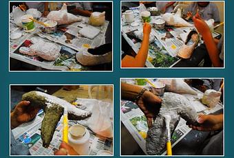Seca la capa de color blanco, se proceda aplicar los colores de las zonas grandes con ( pinceles gruesos ) y finalmente los detalles con ( pinceles delgados ). Las pinturas utilizadas son las témperas y también colores metalizados.