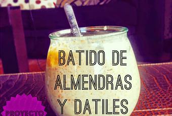 En la batidora de vaso, puse 1/3 de una taza de desayuno de almendras, y las cubrí con agua. Luego añadí 5 dátiles, una pizca de sal (sí, queridas), un poco de coco rallado y una cucharada de esencia de vainilla. La receta original incluía un poco de chocolate rallado, pero yo preferí ponerle mi proteína en polvo de chocolate de Santiveri, porque me lo iba a tomar después de entrenar y me pareció una buena idea post-entrenamiento. Batí todo un minuto o dos, y listo.