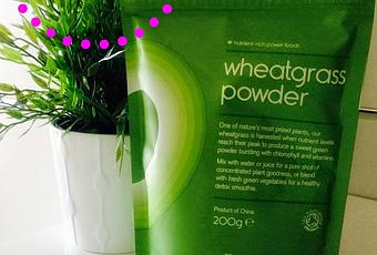 Antes de nada, debo aclarar que no se trata de chupitos de césped estrictamente hablando, sino de hierba de trigo. Se presenta en polvo, y puede añadirse a zumos, agua, batidos e incluso yogur. Yo pongo una cucharadita en el agua templada con zumo de limón que todas las mañanas tomo en ayunas: