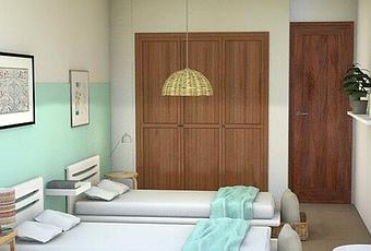 Como veréis, desarrollamos el proyecto de este alojamiento temporal partiendo de la idea de hacer estancias que tuvieran algo en común, pero que al mismo tiempo se diferenciasen en algo concreto. Teniendo en cuenta la premisa de hacer un cambio de look que no fuese difícil de llevar a cabo por los dueños, que se ajustase al presupuesto y que fuese sencillo de mantener, decidimos crear unos zócalos de pintura en todas los dormitorios que hiciesen las veces de cabecero de las camas y le dimos a cada uno, un color y una composición de cuadros especial.