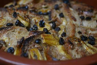 Corta en rodaja alargadas los plátanos y los vas poniendo entre los panes, sin dejarningún pan sin que tenga plátano, luego le agregas las uvas pasas, las nueces así como la miel, la canela y el azúcar moreno.Precalienta el horno a 180 gtados y hornea por unos 40 munitos, sabrás si está listo al meter un cuchillo en el centro y si sale seco ya puedes sacar. Está riquísimo!!!