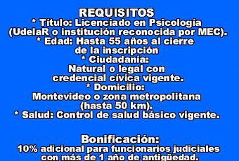 📋 Requisitos Excluyentes✅ Título: Licenciado en Psicología (UdelaR o institución reconocida por MEC).✅ Edad: Hasta 55 años al cierre de la inscripción✅ Ciudadanía: Natural o legal con credencial cívica vigente.✅ Domicilio: Montevideo o zona metropolitana(hasta 50 km).✅ Salud: Control de salud básico vigente.✅ Antecedentes: Sin destituciones en organismos del Estado.✅ Disponibilidad: Para viajar al interior del país cuando sea necesario.