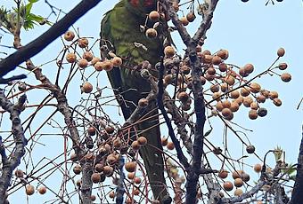 Un grupo de aratingas mitrada sobre un árbol ornamental llamado "Paraiso sombrilla" (su nombre botánico es Melia azedarach), sus semillas se asemejan a las cuentas de un rosario.